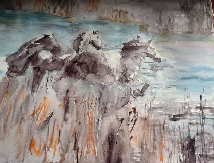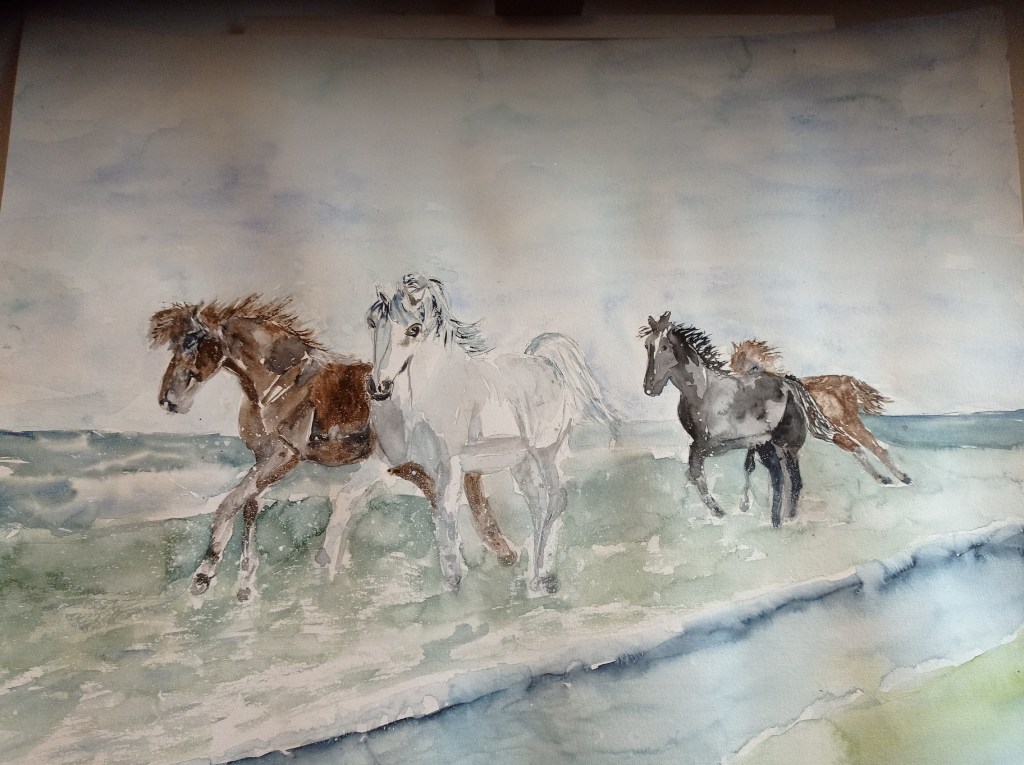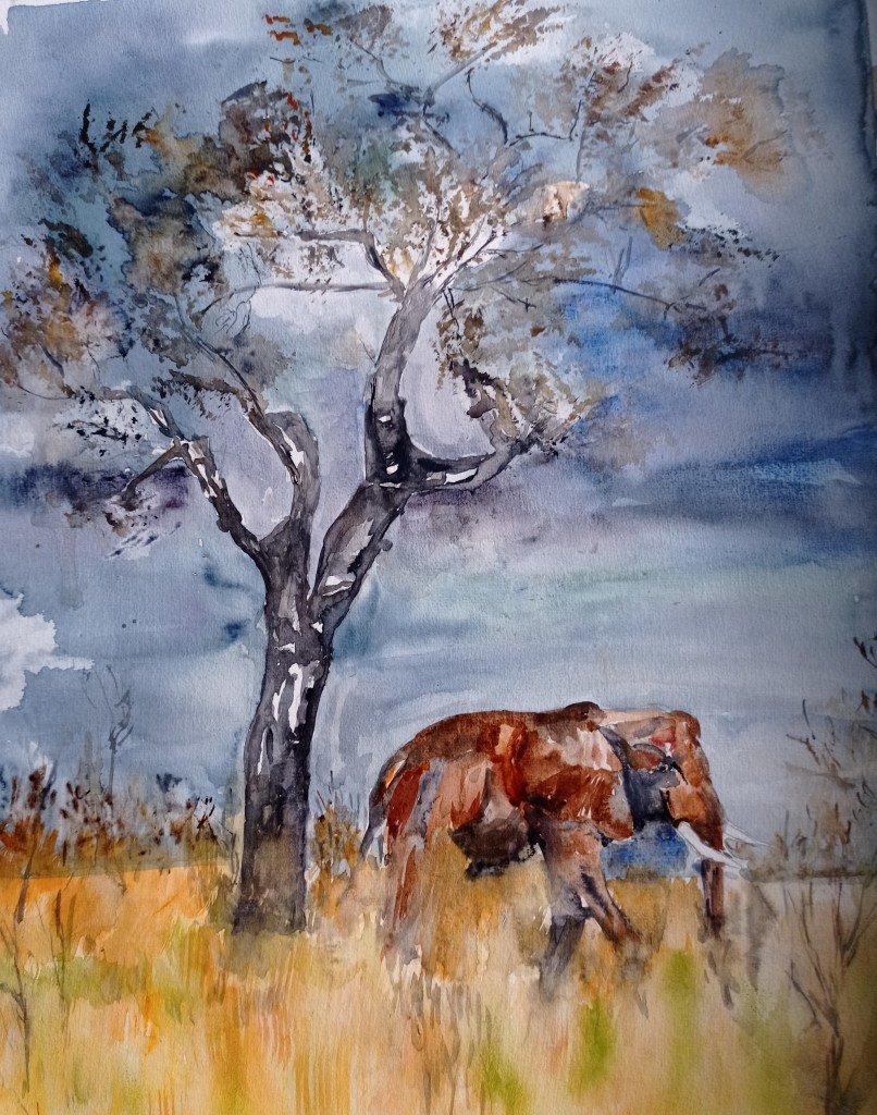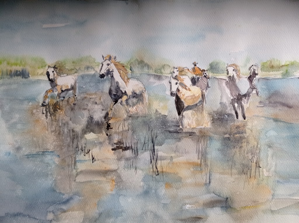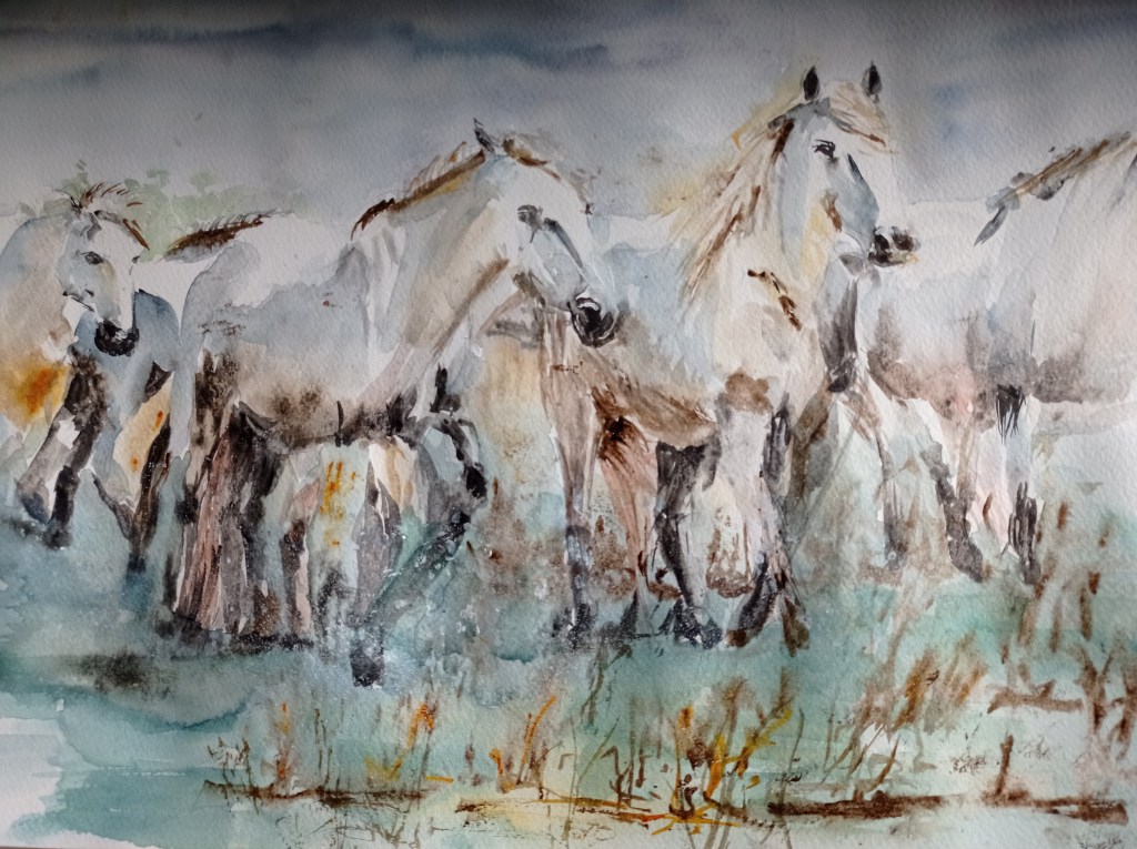 2024 : recherche du mouvement / les Chevaux et Eléphants Les chevaux de Camargue : ne pas rester « figer » et les Eléphants Ce sont de grands formats 40×50 L’éléphant solitaire Troupeau d’éléphants