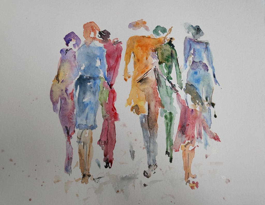 Trop longtemps sans peindre, je retrouve le papier qu’il me faut pour créer une ambiance… et je sors une palette plus colorée…