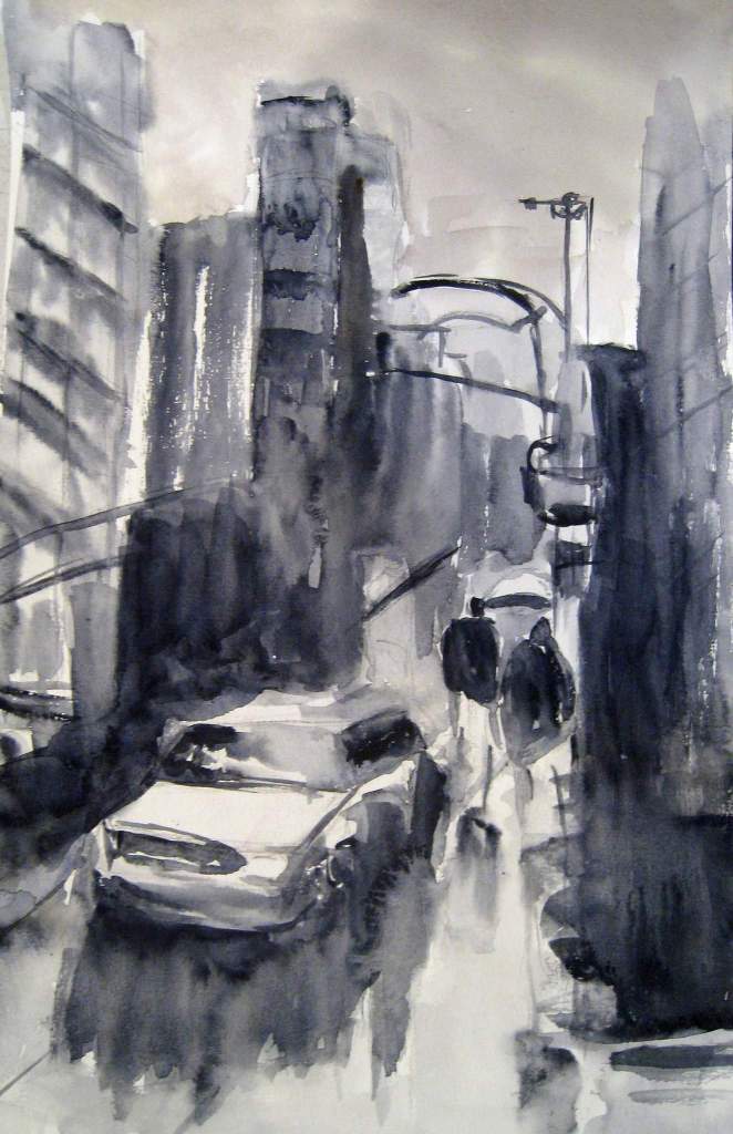 J’ai cherché à la fois suggérer et affiner les bâtiments , tout en gardant un flou qui permet de faire deviner et créer de la lumière.
